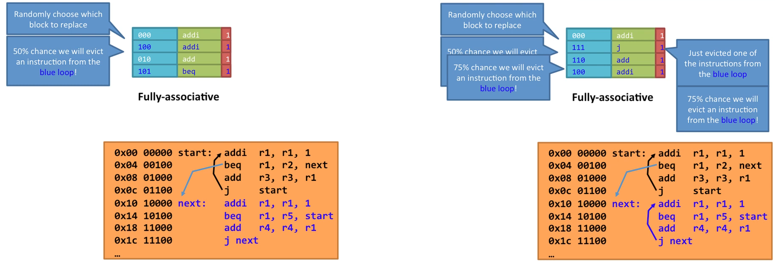 예를 들어, 검은색 루프와 파란색 루프 두 개로 구성된 프로그램을 실행할 때, 각 루프의 명령어가 차례로 캐시에 로드된다. 검은색 루프에서 파란색 루프로 전환할 때, 랜덤 교체 정책은 임의로 블록을 제거하기 때문에 때로는 재사용될 파란색 루프의 명령어가 제거될 수 있다.