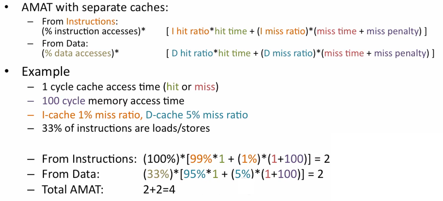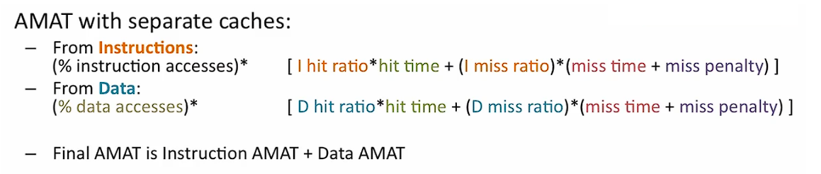 AMAT = (인스트럭션 캐시 AMAT × 인스트럭션 접근 비율) + (데이터 캐시 AMAT × 데이터 접근 비율)