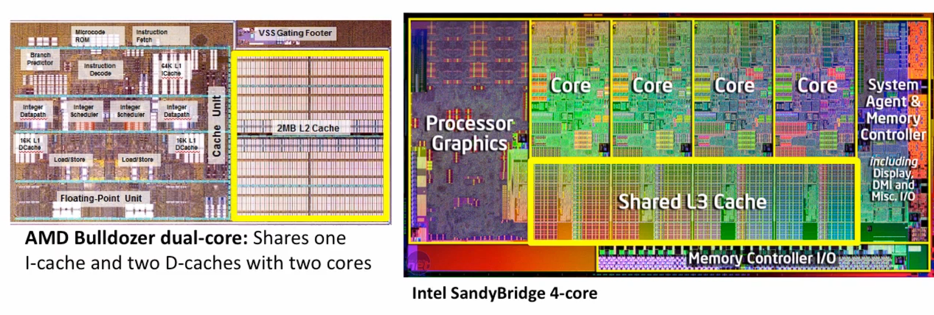 - AMD의 Bulldozer 프로세서: 두 개의 코어를 가지고 있으며, 인스트럭션과 데이터 캐시가 포함되어 있다.