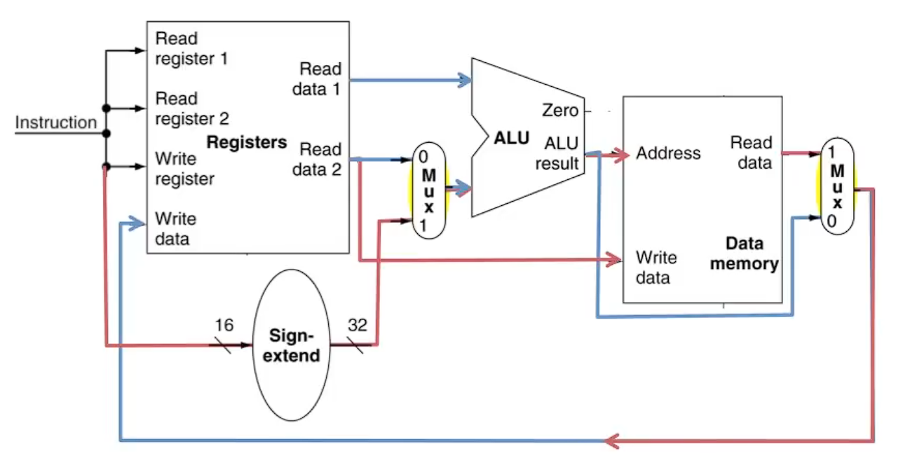 - 첫 번째 MUX는 ALU 입력을 레지스터 파일에서 가져올지, sign-extended 즉시값에서 가져올지를 선택한다. R 형식 명령어의 경우 항상 레지스터 파일을 선택하고, I 형식 명령어의 경우 즉시값을 선택한다.