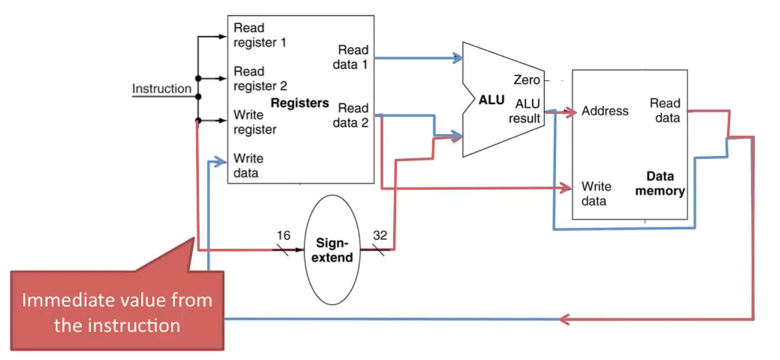 즉시값(immediate)을 처리하기 위해서는 부호 확장(sign extension) 로직이 필요하다. 이 즉시값은 명령어의 필드에서 가져와 부호 확장 후 ALU에 입력된다.
