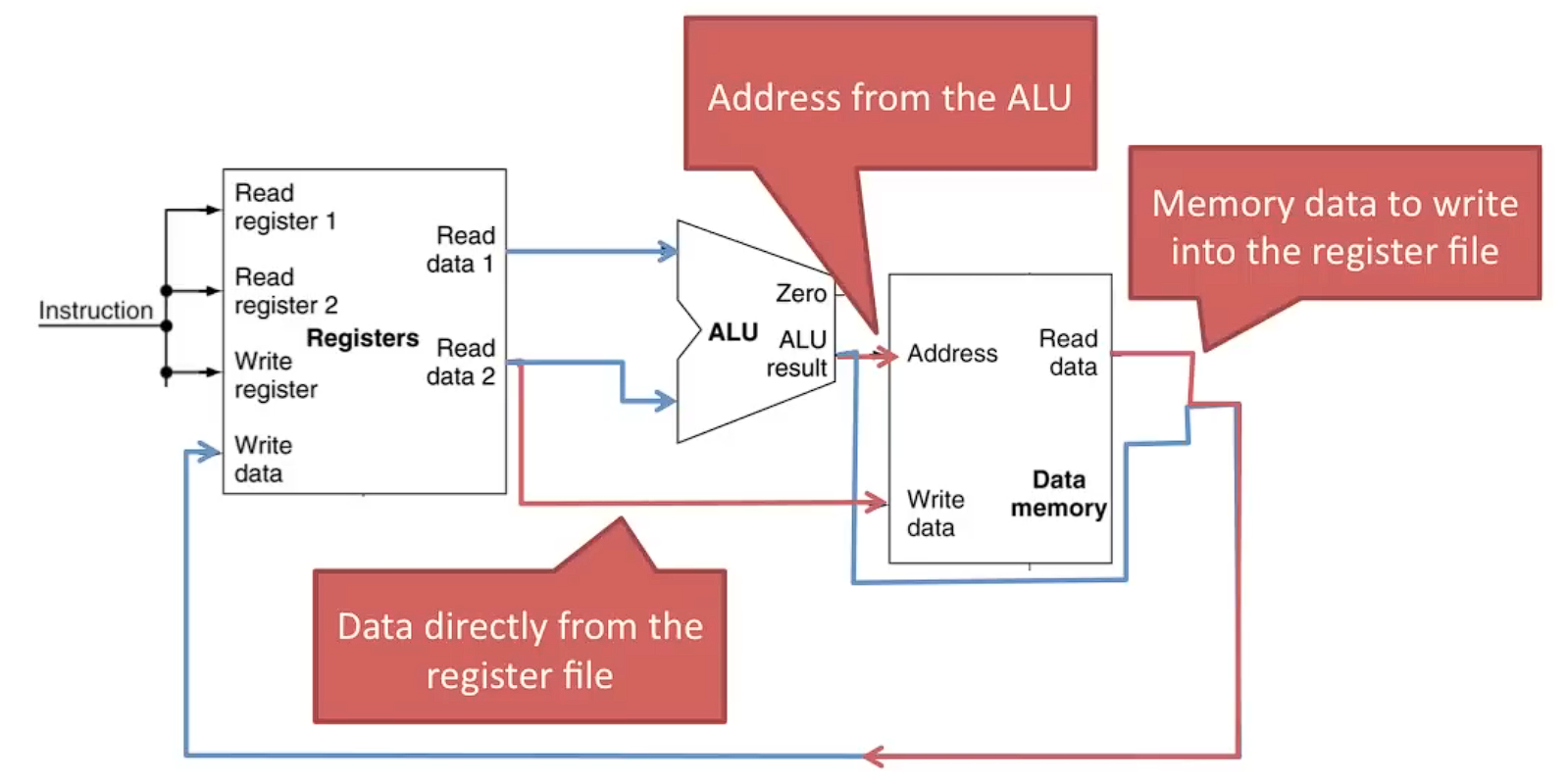 저장 명령어의 경우 레지스터 파일의 값을 저장하며, 주소는 ALU에서 직접 가져온다.