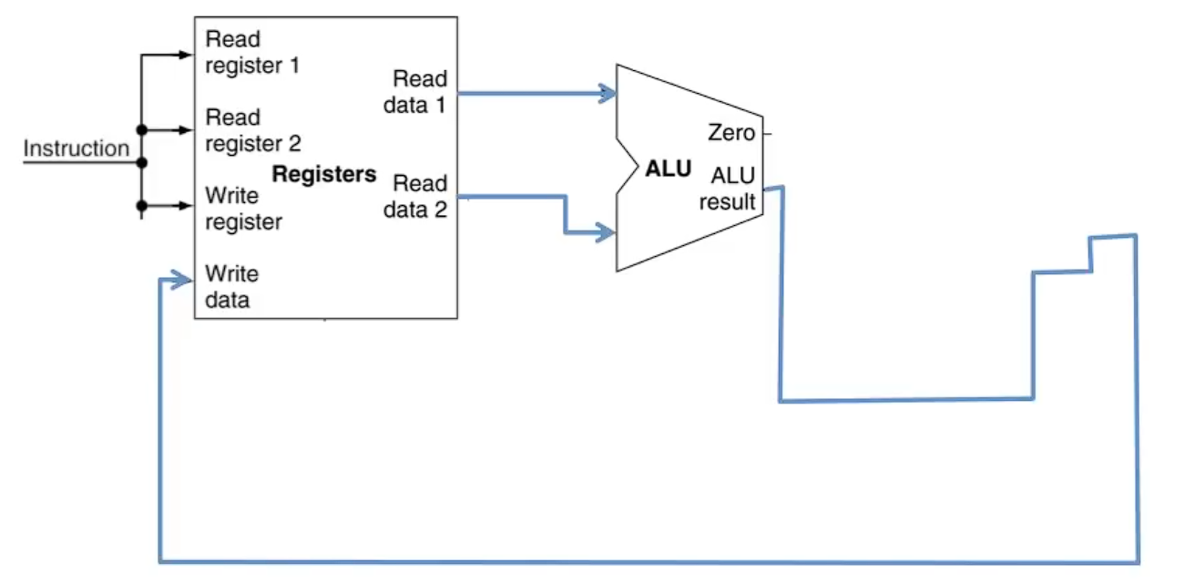 레지스터 파일과 ALU는 이미 연결되어 있다. 레지스터 포트의 출력을 ALU로 보내고, ALU의 출력을 다시 레지스터에 넣는다.