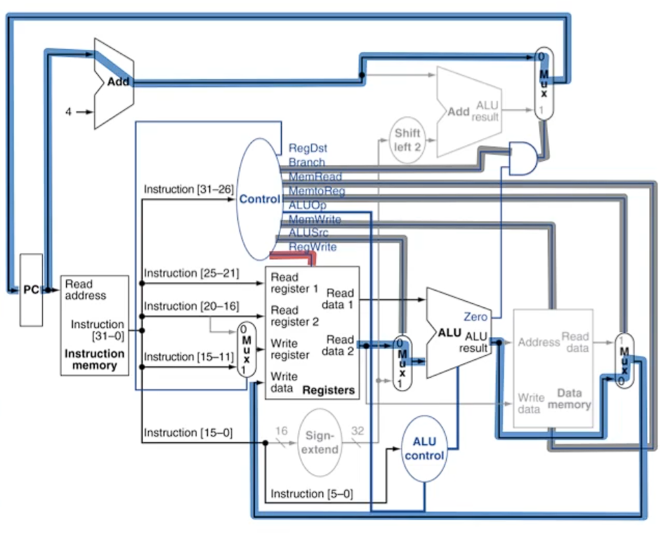 - ALU Source: 0으로 설정하여 즉시 값을 사용하지 않고 레지스터 파일의 두 번째 출력을 사용한다.