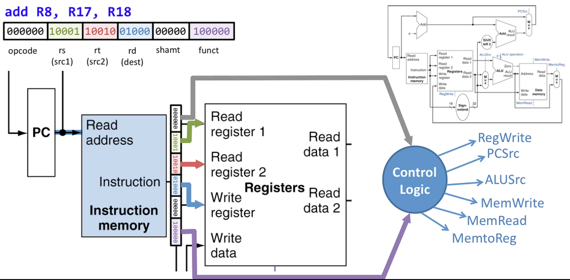 - 예시로 add R8, R17, R18과 같은 R 타입 명령어는 OP 코드, 세 개의 레지스터, 시프트 수, 그리고 함수 코드를 포함하며, 이 정보는 제어 논리에 입력되어 각 부품의 제어 신호를 설정한다.
