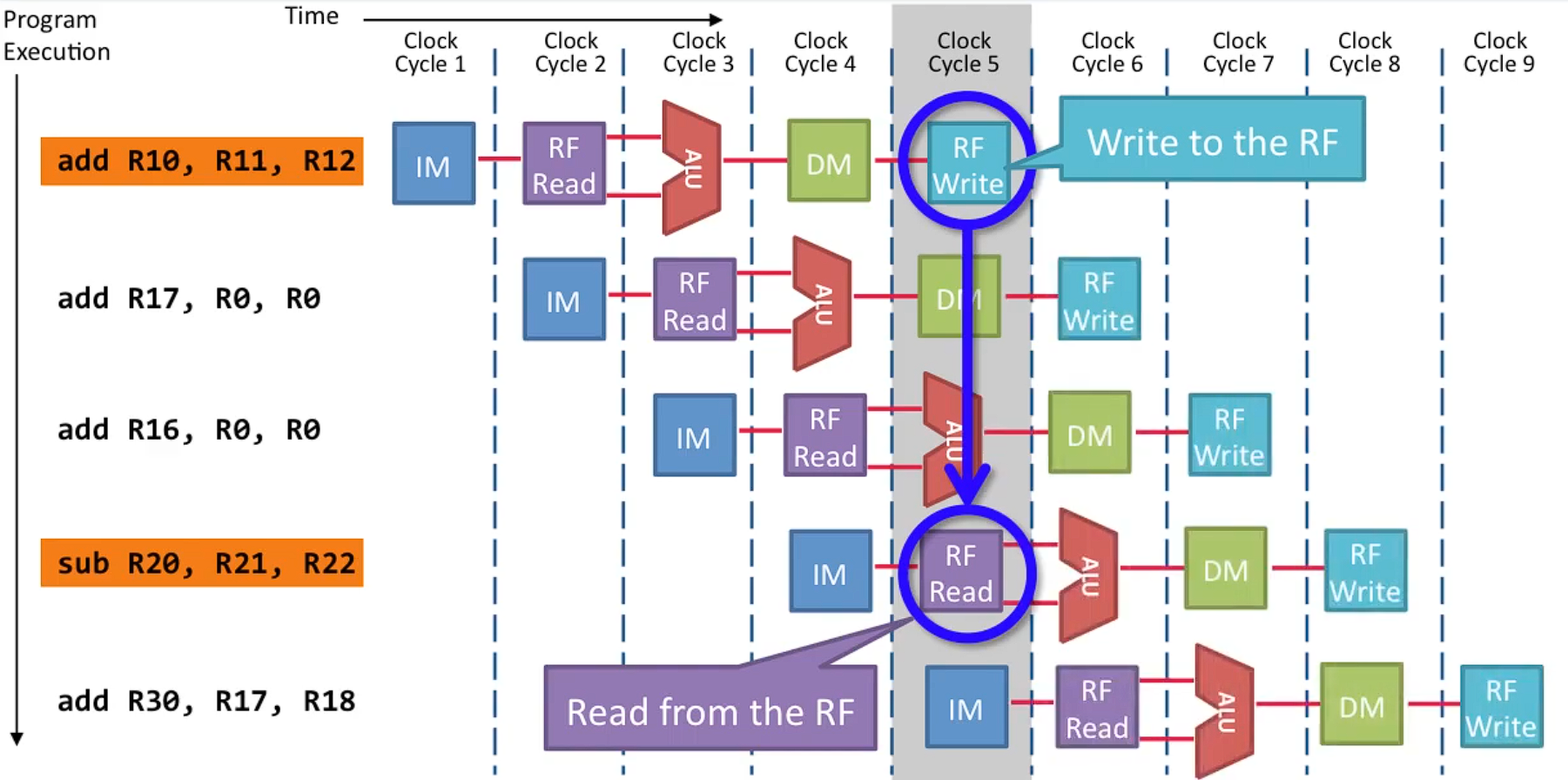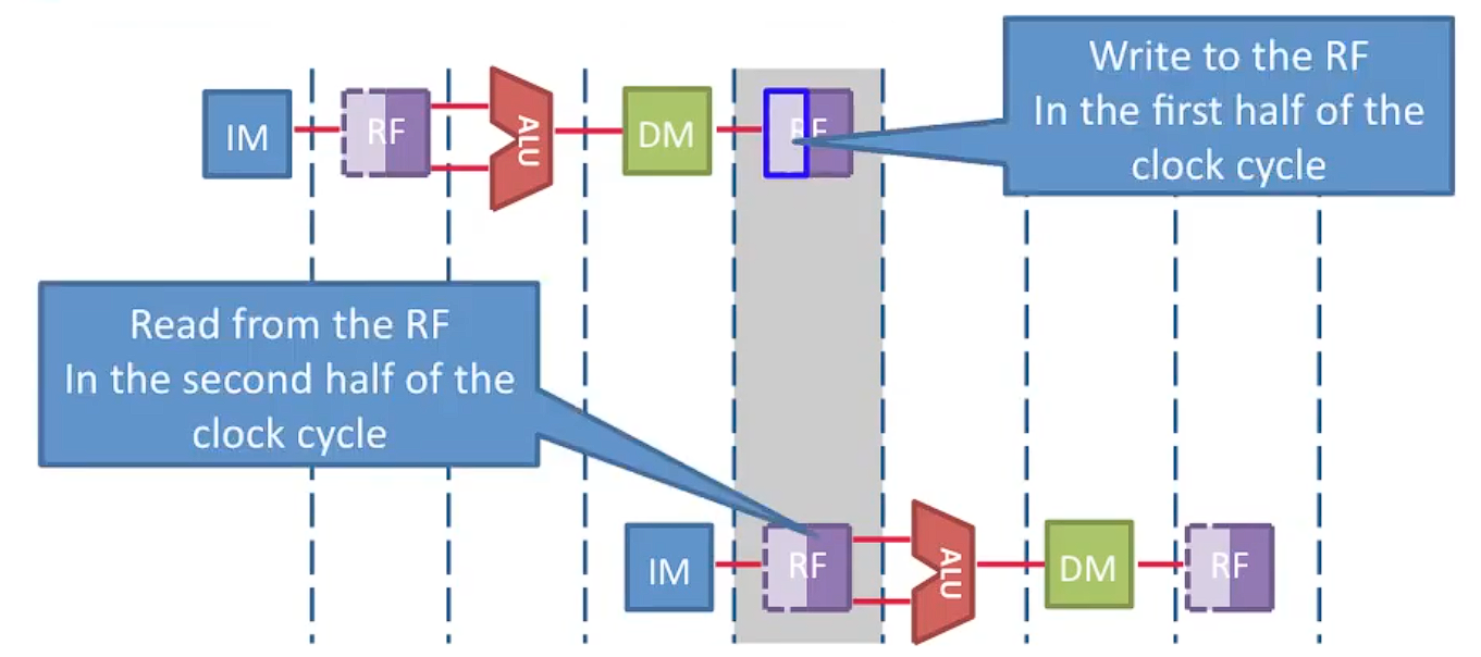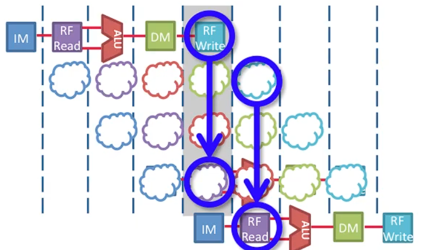 - 예를 들어, 한 명령어는 write-back 단계에서 레지스터 파일에 쓰기를 시도하고, 다른 명령어는 instruction decode 단계에서 읽기를 시도하는 상황이다.