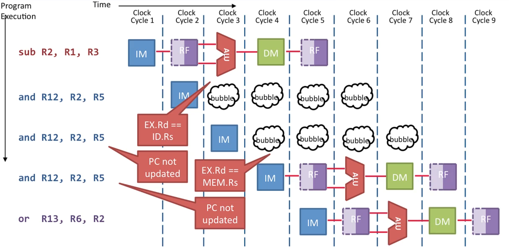 즉, bubble 을 만드려면.. register file, memory, pc 에 아무것도 쓰지 않으면 된다.