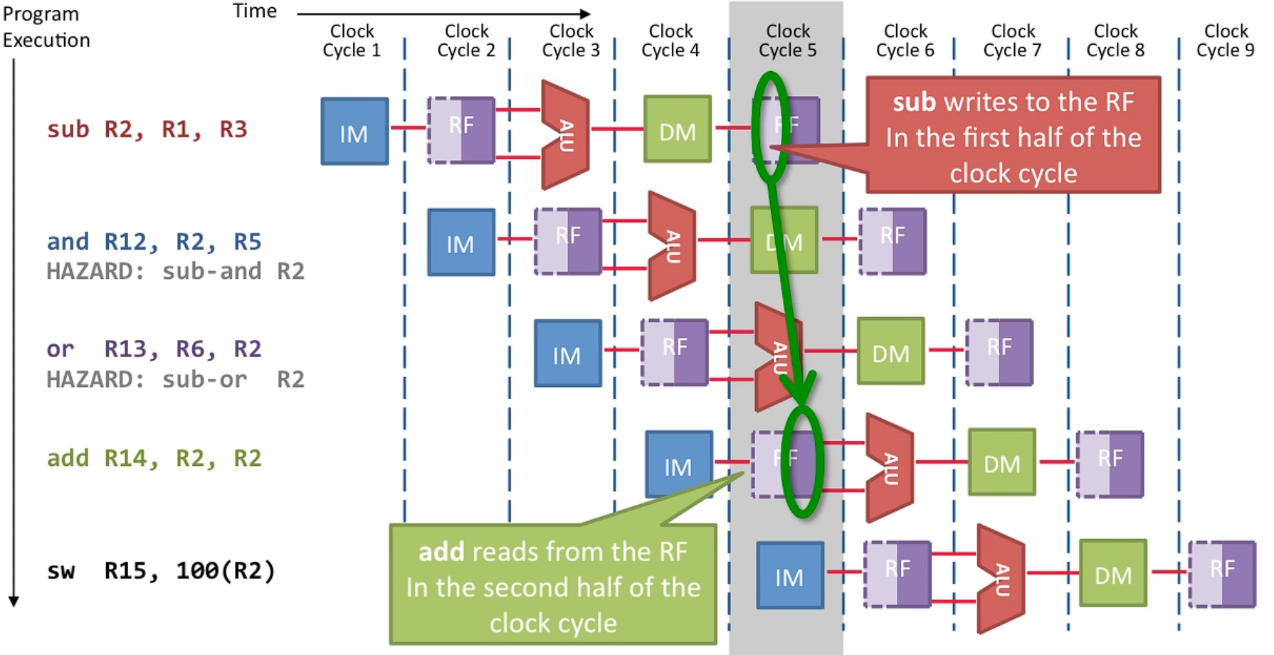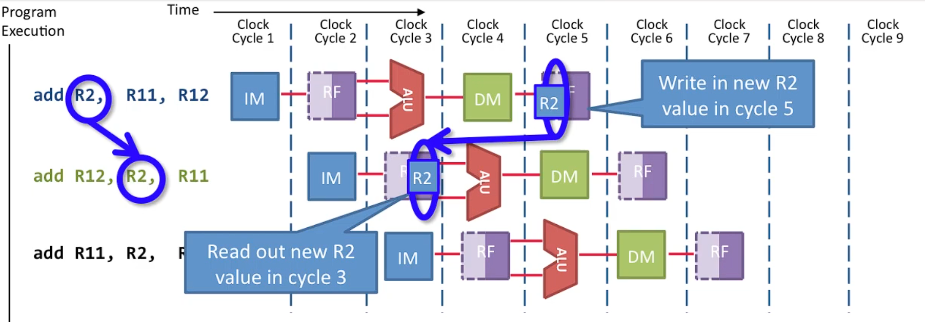 - Add 명령어는 WB 단계에서 R2 값을 읽음.