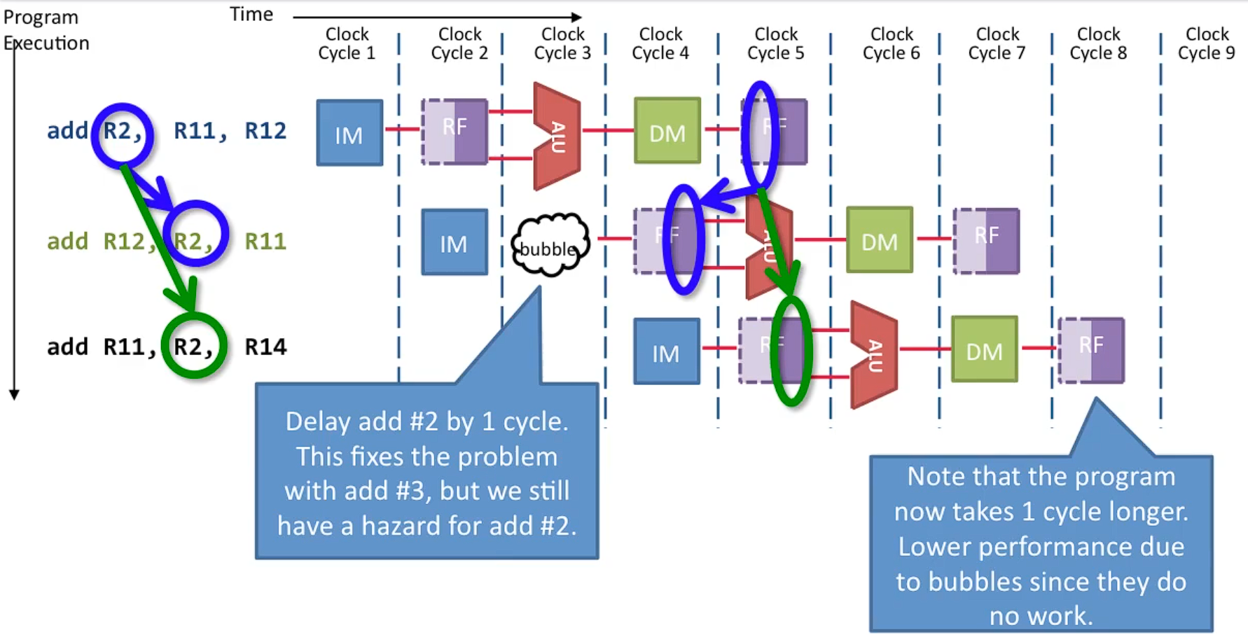 - 단점: 파이프라인에 버블이 삽입되어 실행 성능이 감소한다.