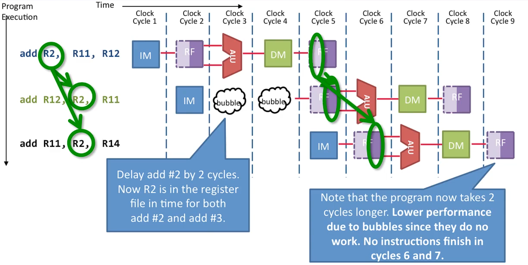 - 프로그램 실행 중 7개의 클록 사이클 중 2개는 버블로 채워짐.