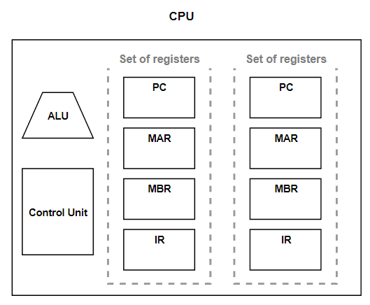 하나의 코어로 여러 명령어를 동시에 처리하려면 PC, 스택 포인터, 데이터 버퍼 레지스터, 데이터 주소 레지스터와 같은 필수 레지스터들을 여러개 가지고 있어야 한다.