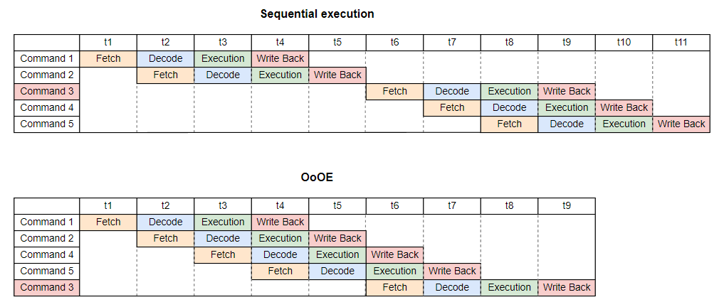 아래의 예시를 보자. Command 3 이 Command 2와 의존성이 있어 파이프라인이 멈추는 경우와 이를 비순차적으로 처리하여 파이프라인이 멈추는 것을 방지한 예시이다.