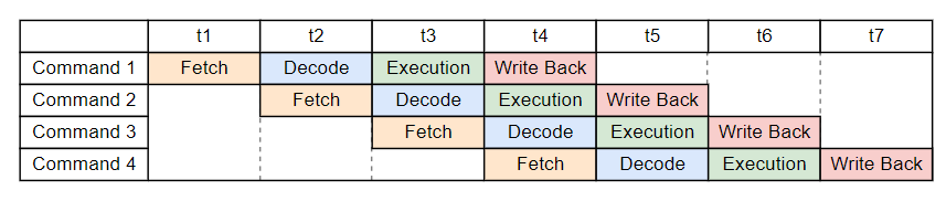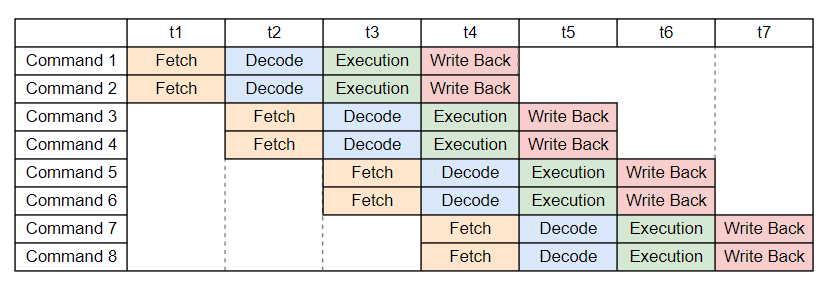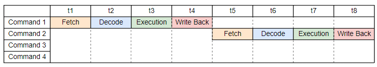CPU 가 Decoding 을 하는 클럭주기에 동시에 명령어를 Fetch할 수 있다. 이렇게 겹쳐서 수행을 하면 훨씬 효율적으로 명령어를 처리할 수 있는 것이다. 만약 순차적으로 처리한다면, 아래와 같이 명령어 두개를 처리하는데에만 t8 이 소요될 것이다.