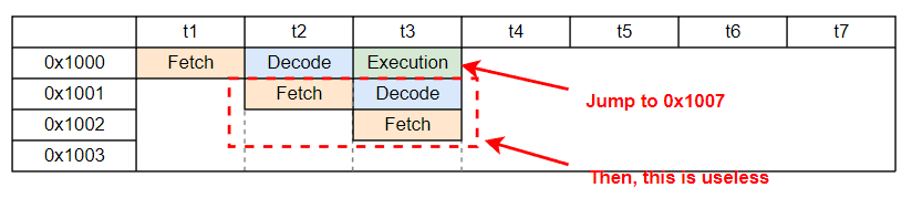 기본적으로 PC 값은 매 싸이클마다 1씩 더해지면서 '현재 실행 중인 명령어의 다음 주소' 로 갱신된다. 그런데 만약 if 문과 같은 분기를 맞이하면 PC 값은 갑작스레 변화가 생기면, 명령어 파이프 라인에 미리 가져와 처리중이었던 명령어들은 아무 쓸모가 없어진다. 이를 Control hazard 라고 한다.