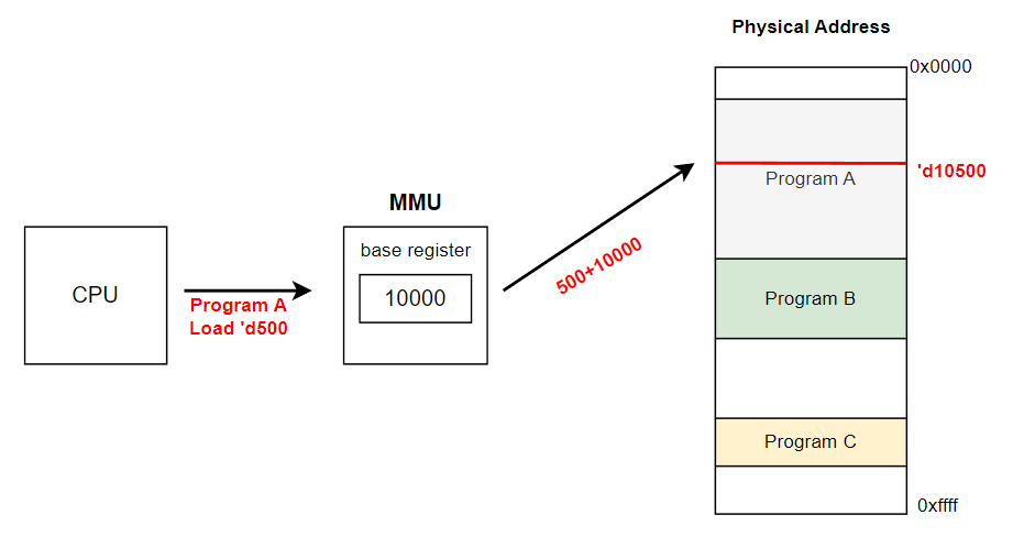 아래 그림과 같이, 실제로 MMU를 거치게 되는데, 프로그램의 첫 physical address 가 저장된 base register 값과 logical address값을 더해서 메모리에 접근하게 된다.