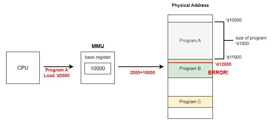 아래의 상황을 가정해보자. 프로그램에 버그가 발생하여 Logical address가 잘못되었다. 그 결과 타 프로그램의 주소에 접근하는 상황이 발생하게 된다. 이는 큰 오류를 발생시킬 수 있으므로 절대 이루어져서는 안된다.