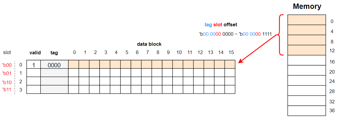 처음에 0번지를 읽을 때 캐시메모리는 비어있으므로 cache miss 가 발생하고, 메인메모리에서 0~15번지의 내용을 복사하여 가져온다. 주소는 'b000000 에서 'b001111 이므로, 0번째 slot 에 저장된다. (아래 그림 참고)