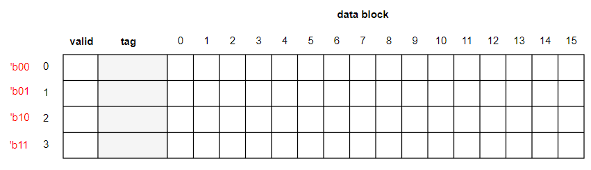 0은 'b00000 이고 15는 'b01111 이다. 즉 블록에 포함될 데이터 주소는 'b0xxxx 이므로 태그에는 이진수 'b0 을 기록한다.