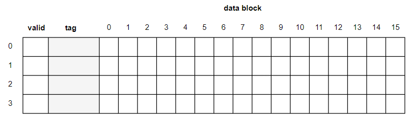 아래 그림은 4x16 형식의 캐시 메모리 구조 예시이다. 4개의 데이터 블록이 있으며, 각 블록의 크기는 16바이트 라는 의미이다.