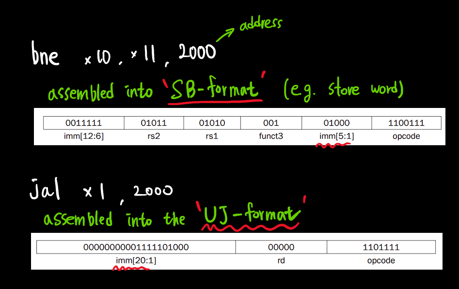 RISC-V 분기 명령어는 12비트 immediates 를 사용하는 명령어 format 을 사용하는데. 이 형식은 -4096~4094 까지의 범위만 사용 가능하다.