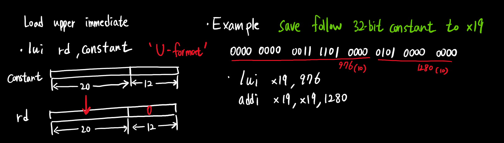대부분의 상수들은 주로 12비트나 그 아래의 값을 가지기 때문에, 기존 I-type 명령어의 12비트 필드도 충분하지만 그 이상의 비트를 필요로 할 때도 있다.