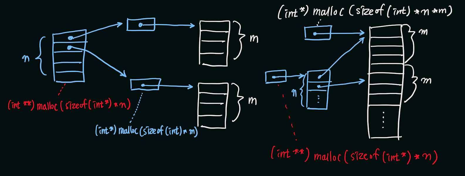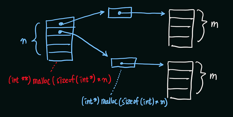 먼저 전체 배열에 대한 메모리를 할당하고, 그 다음에는 각 행의 시작점을 가리키는 포인터 배열을 할당한다.