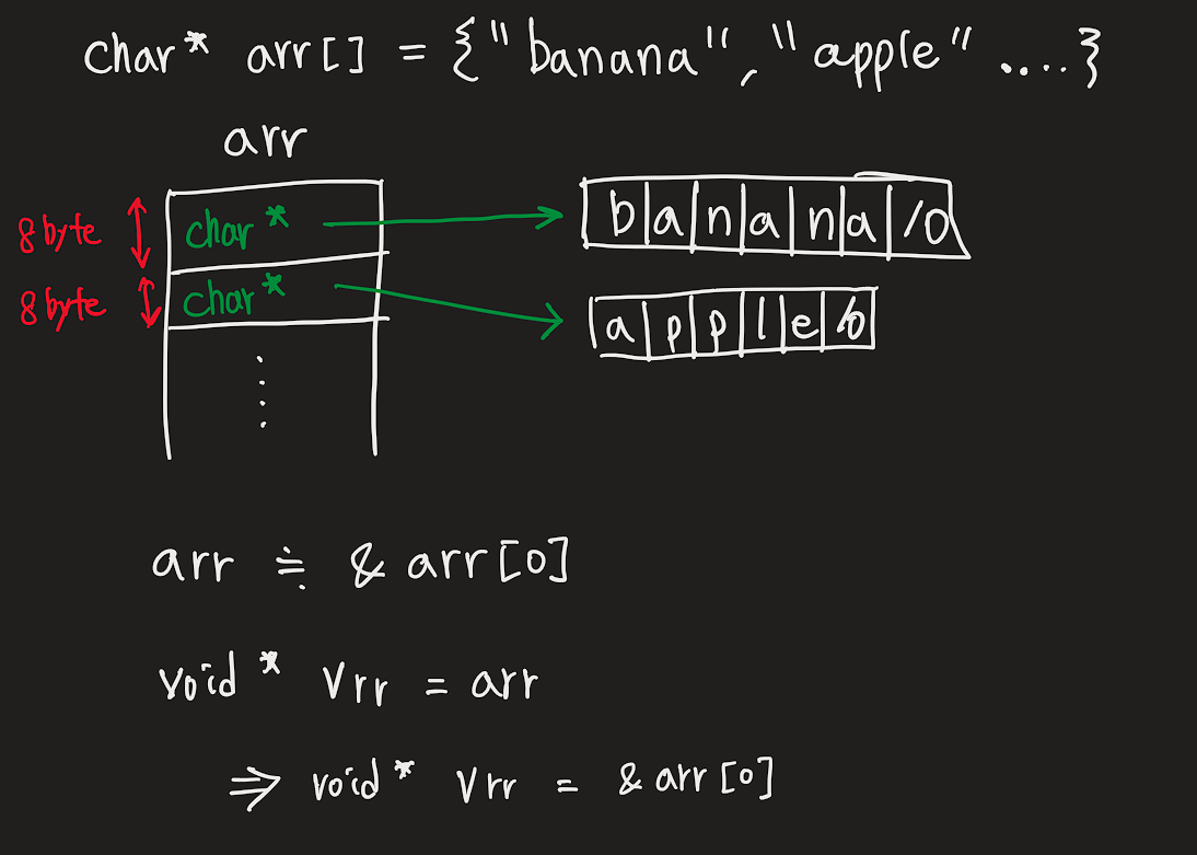 - arr는 char* 타입의 요소를 저장하는 배열이기 때문에, 이를 char** 타입으로 볼 수 있다.