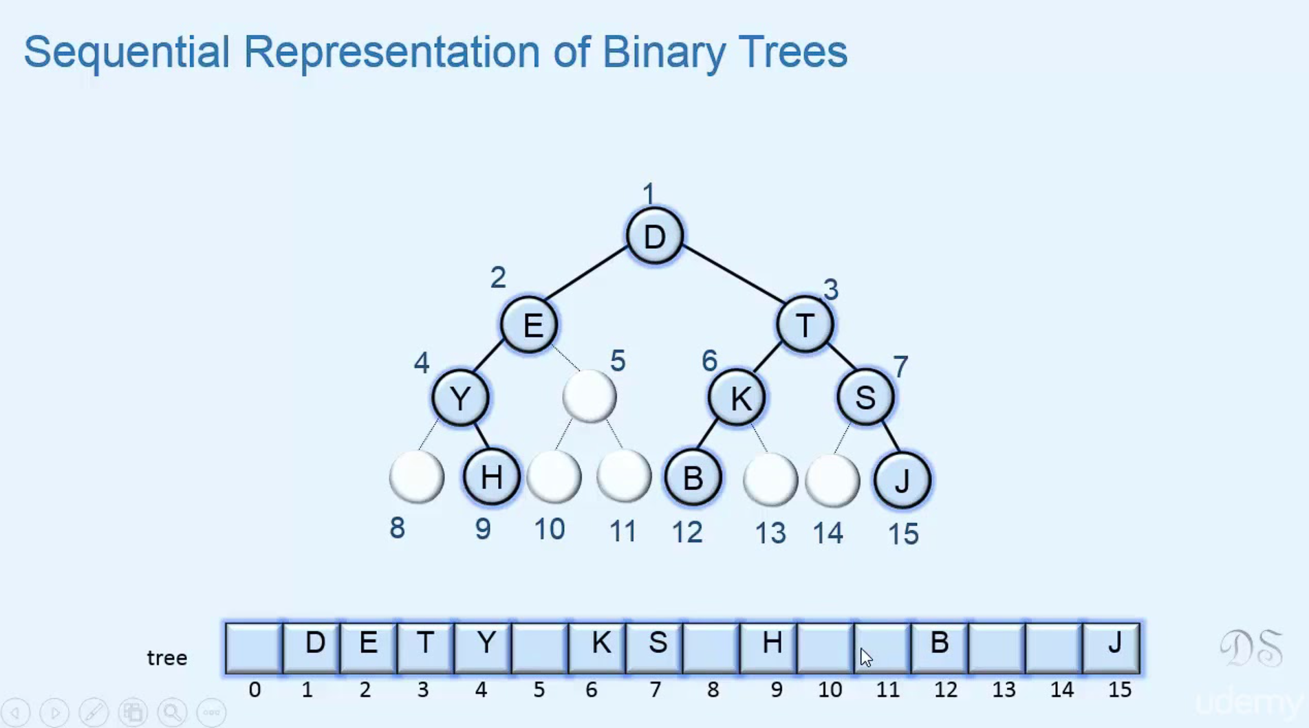 각 레벨에 노드가 꽉 차있는 이진트리이다. 위 와 같이 노드에 번호를 붙일 수 있다. (왼쪽 부터 오른쪽) 이 번호는 항상 일정하다. 즉, 루트의 오른쪽 자식 노드는 항상 3번이다.
