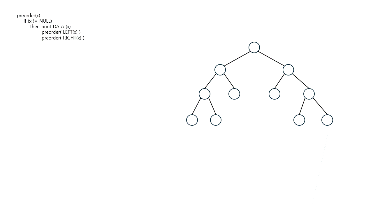 즉 전위 순회는 루트 부터 시작해서 왼쪽 서브트리를 다 탐색한 다음 오른쪽 서브트리로 넘어간다는 뜻이다.