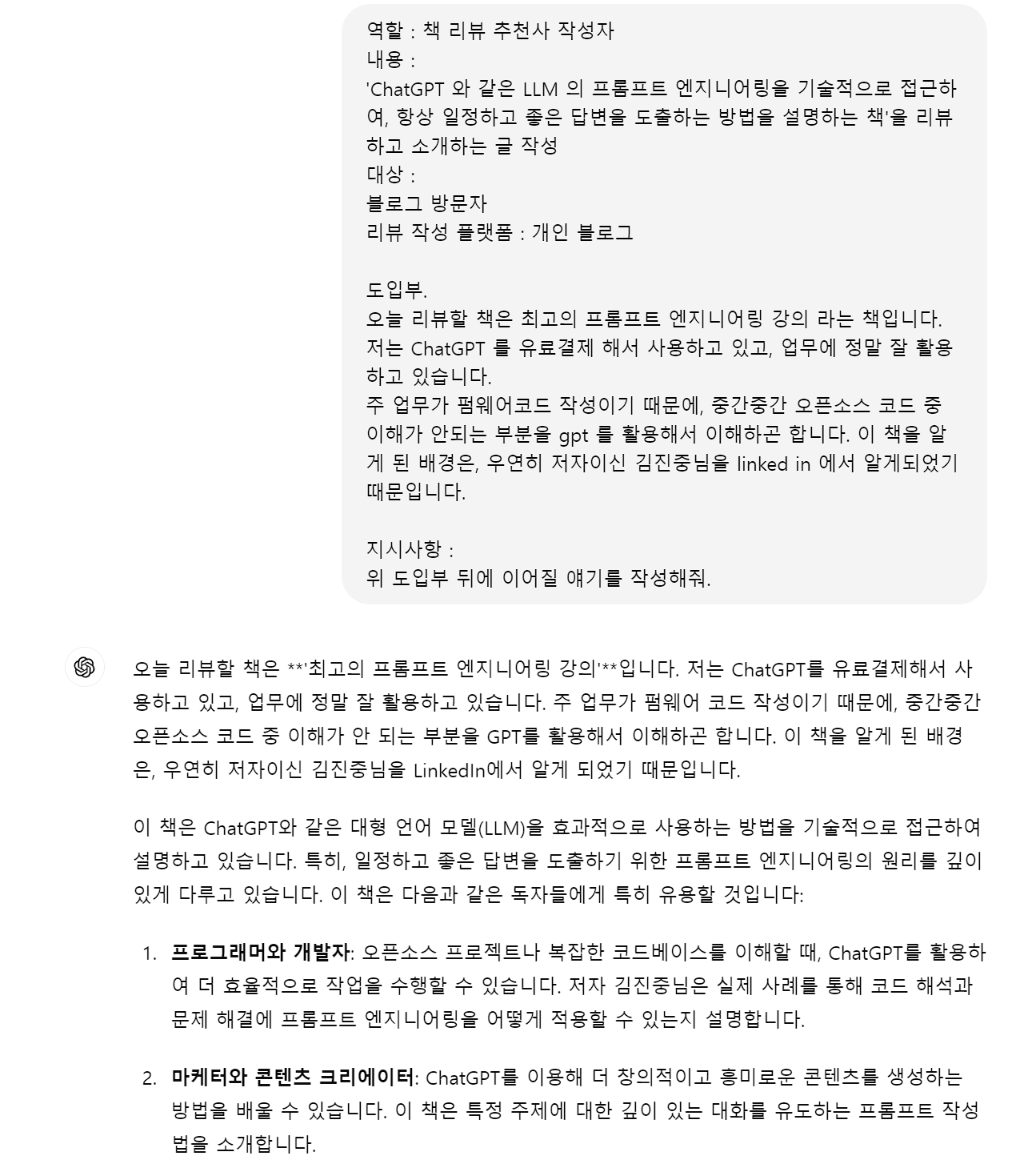 - 마케터와 콘텐츠 크리에이터: ChatGPT를 이용해 더 창의적이고 흥미로운 콘텐츠를 생성하는 방법을 배울 수 있습니다. 이 책은 특정 주제에 대한 깊이 있는 대화를 유도하는 프롬프트 작성법을 소개합니다.