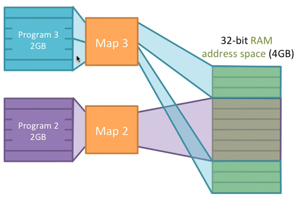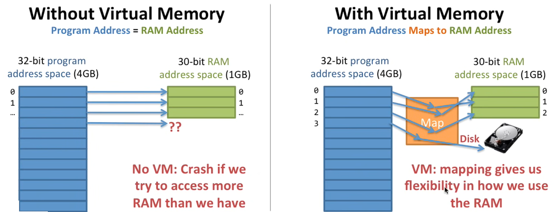 위에서 말했듯, 가상 메모리는 이 문제를 해결하기 위해 프로그램 주소를 물리 메모리 주소로 매핑하는 맵을 제공한다. 이를 통해 프로그램의 주소가 실제로 어떤 물리 메모리 주소에 대응할지를 결정할 수 있다.