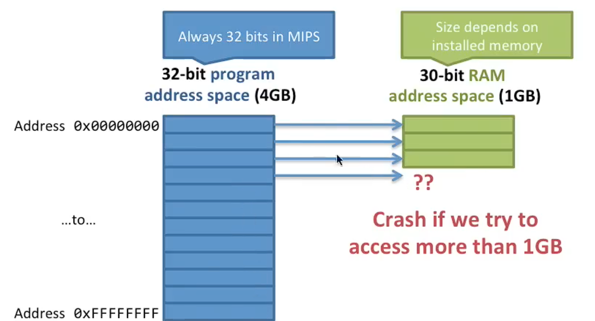 예를 들어, 프로그램이 주소 1024를 참조하면 실제 RAM의 1024번 주소를 직접 참조하게 된다. 만약 컴퓨터에 1GB의 RAM만 설치되어 있다면, 프로그램이 그 이상의 주소를 참조할 경우 시스템이 충돌하게 된다.