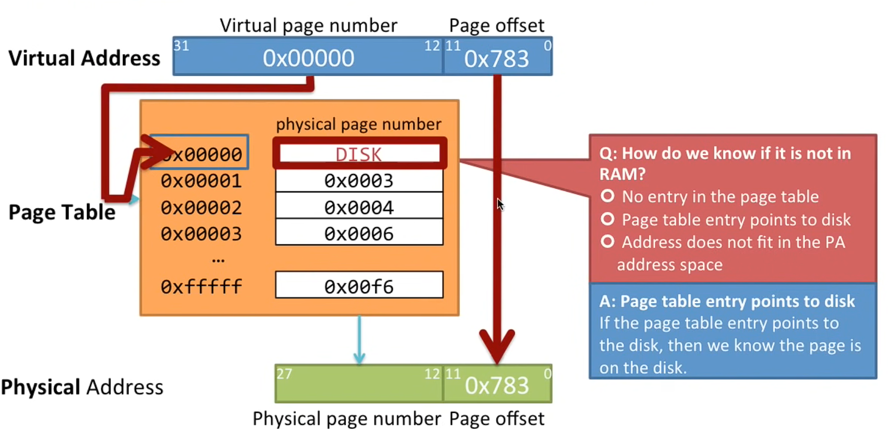 - 페이지가 RAM에 없는지 확인: 페이지 테이블에서 해당 페이지가 디스크에 있다고 표시된 경우 페이지가 RAM에 없음을 알 수 있다.